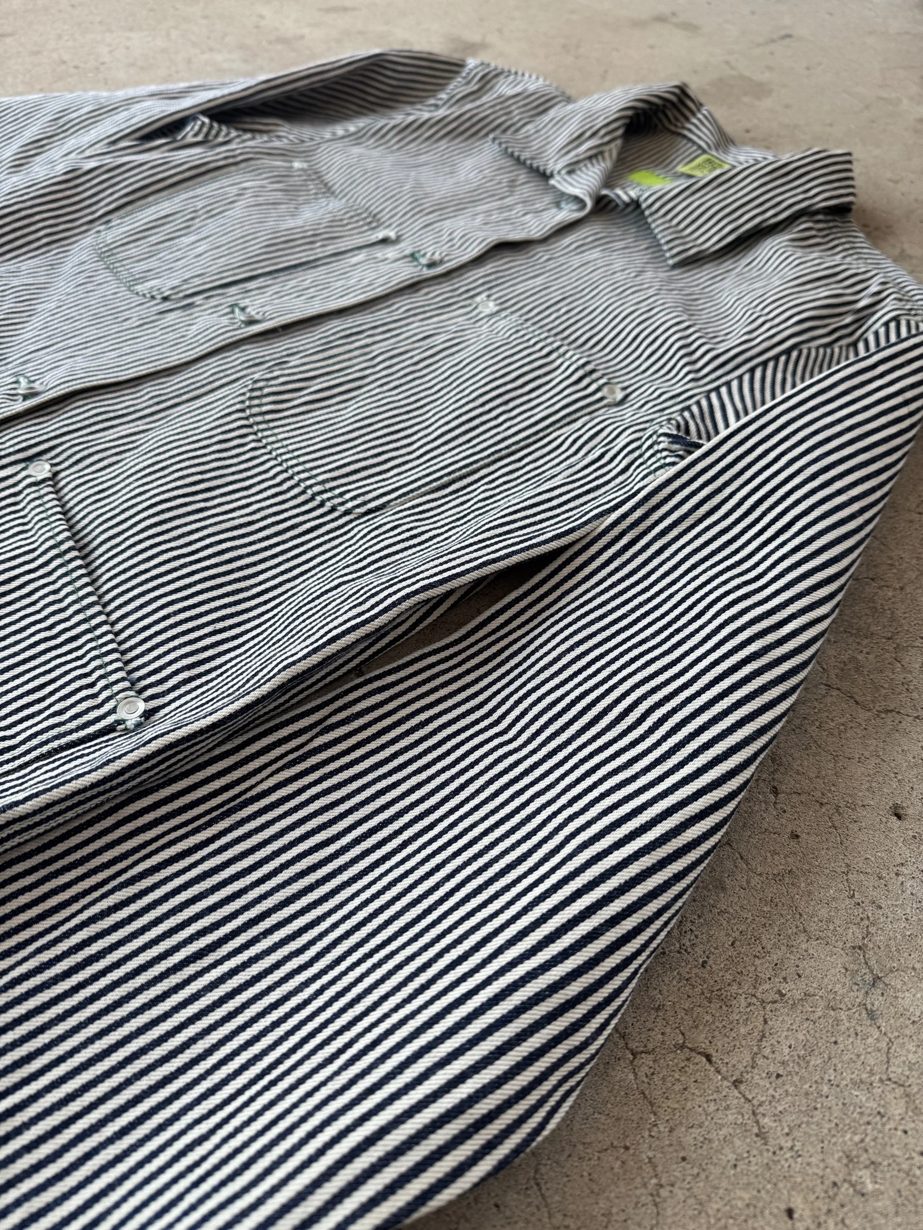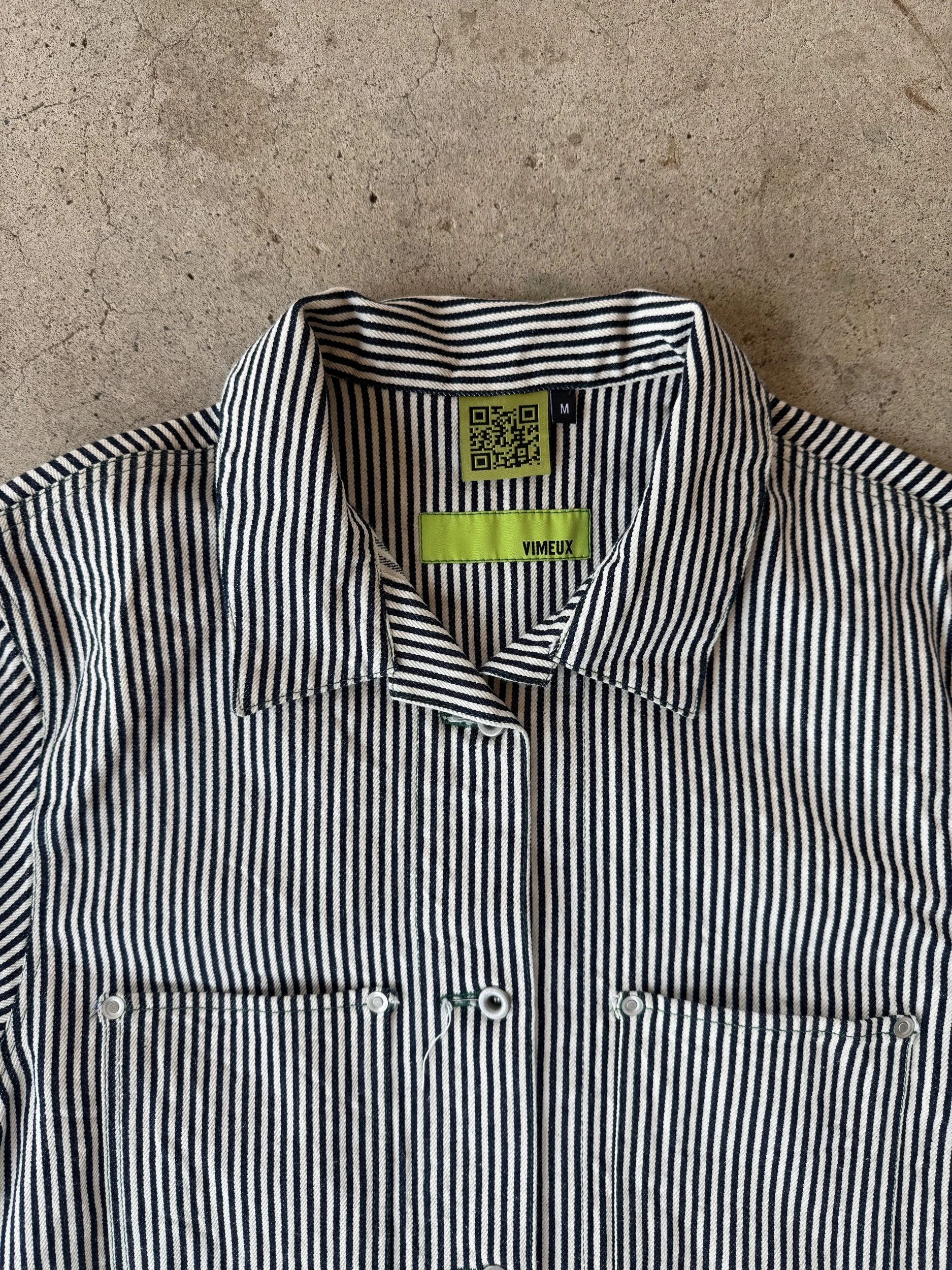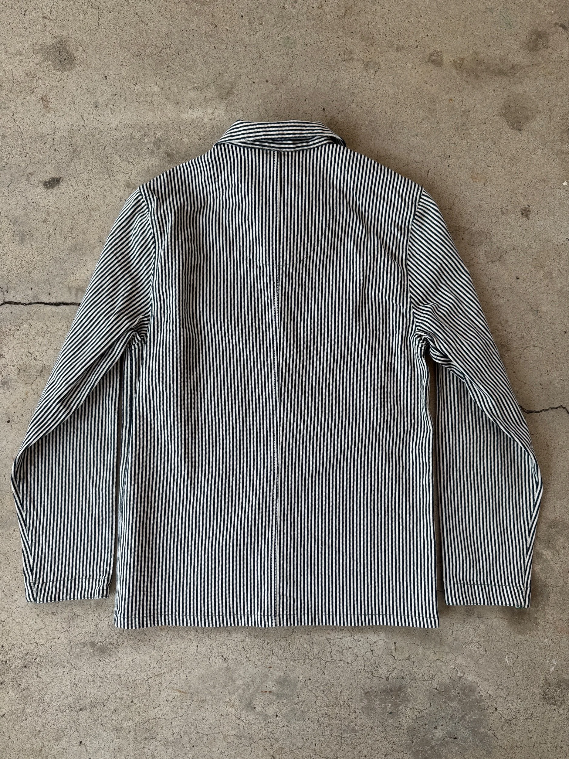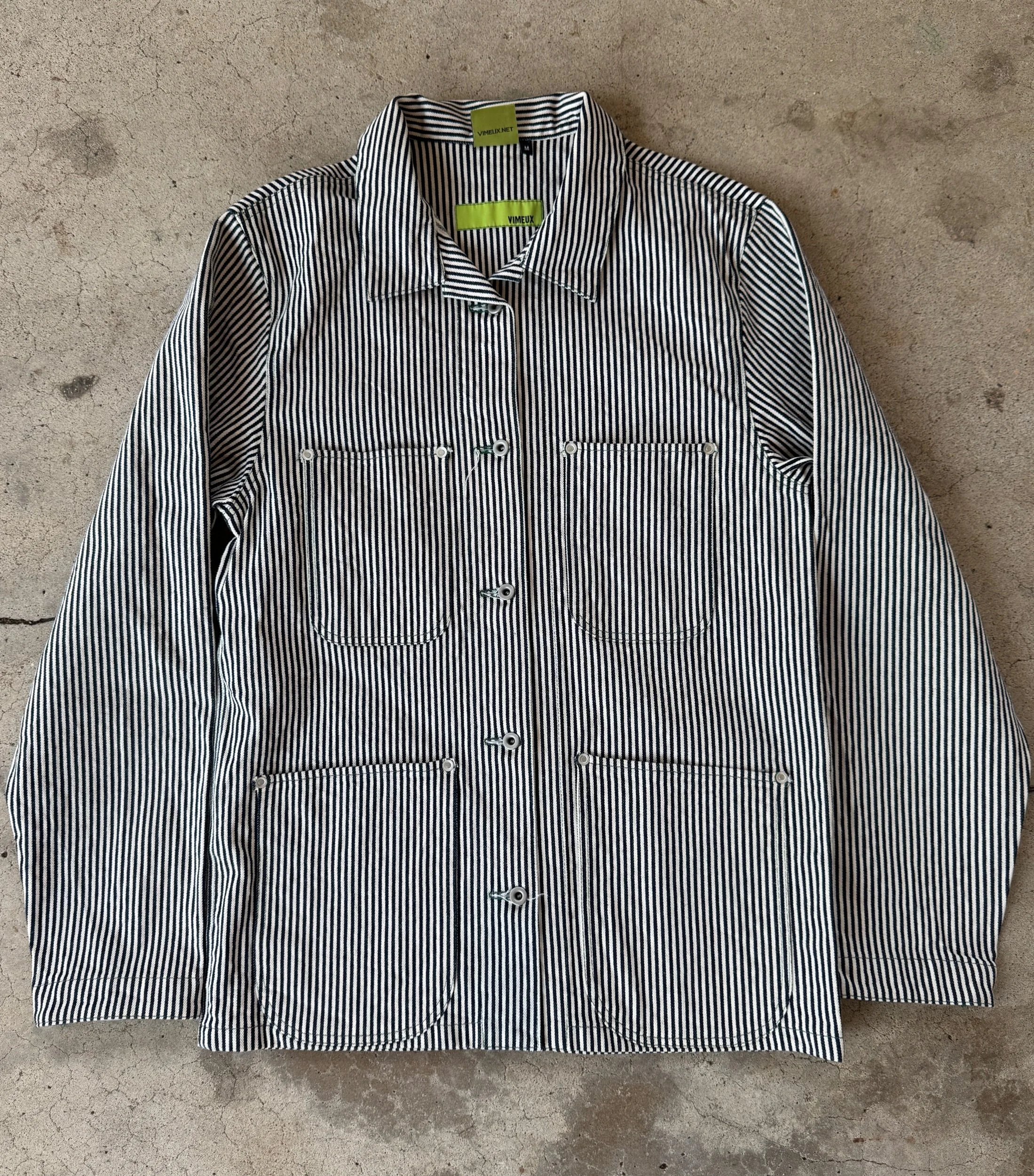 Constructed with a 14oz hickory stripe twill, then accentuated with raw iron buttons and hammered iron rivets, ready to make this jacket even more unique to the wearer. Entirely cut and sewn using hand cut panels at the Vimeux Studio in California.